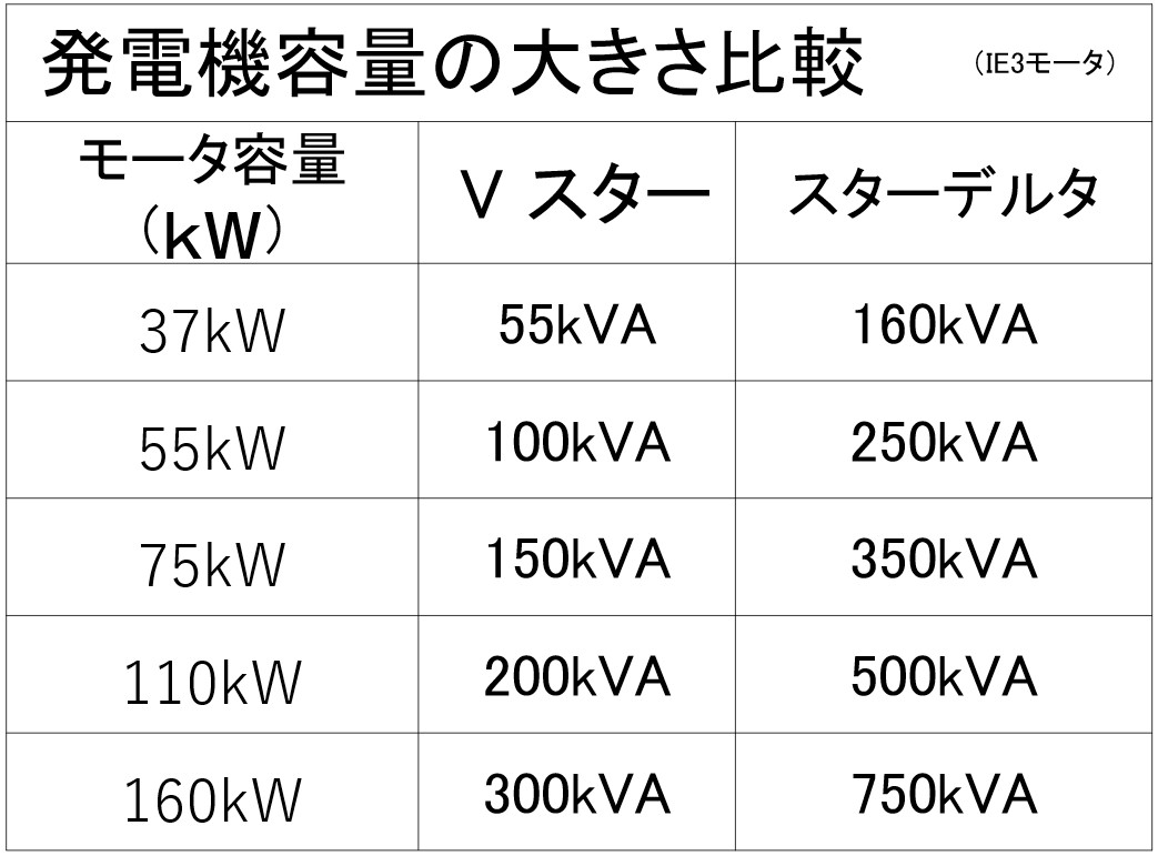 このように、Vスターは発電機の特性を利用してその最大の能力を引き出すことが出来る始動器で、発電機容量は初期始動の 50% 電圧で決定され、一方モータの始動トルクは 70% 電圧により決定されます。Vスターは最小の発電機容量と最大のトルクの両方を満足する理想的な始動器です。
